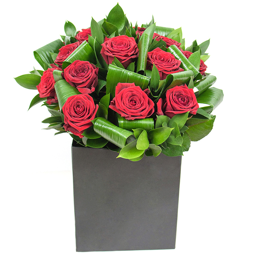Delight in the beauty and uniqueness of our premium bouquet, where passionate red roses meet lush aspidistra leaves and tender ruscus. This sophisticated design exudes an air of elegance and artistic charm, perfect for any special occasion. The rich color palette and thoughtful composition create a warm and inviting ambiance wherever it is displayed.